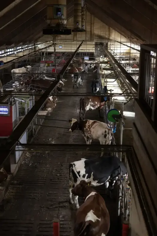 I fjøset tar vi imot på galleriet og får en god oversikt over kuhverdagen derfra. Mattilsynet har skjerpet inn regelverket så vi får beundre kuene på litt avstand.