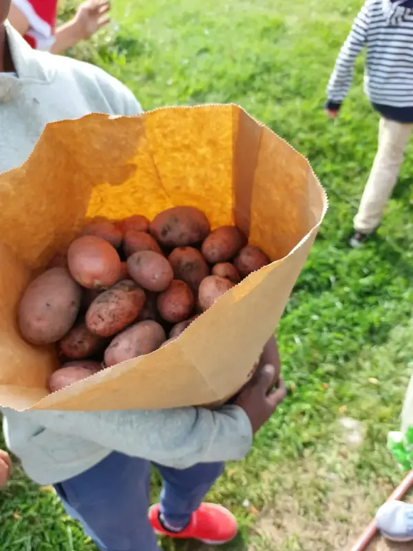 During the summer, we make 2–3 hay cuts to ensure we have enough homegrown feed for our livestock. Manure is spread, and the fields we graze are maintained with a pasture mower to control weeds that the animals won’t eat. Potatoes are harvested and either taken home or used by the gold-certified organic kitchen at the Nursery. We grow various useful crops that visitors can recognize and taste. We also use intercropping principles, planting flowers among the vegetables to protect them from insect attacks.